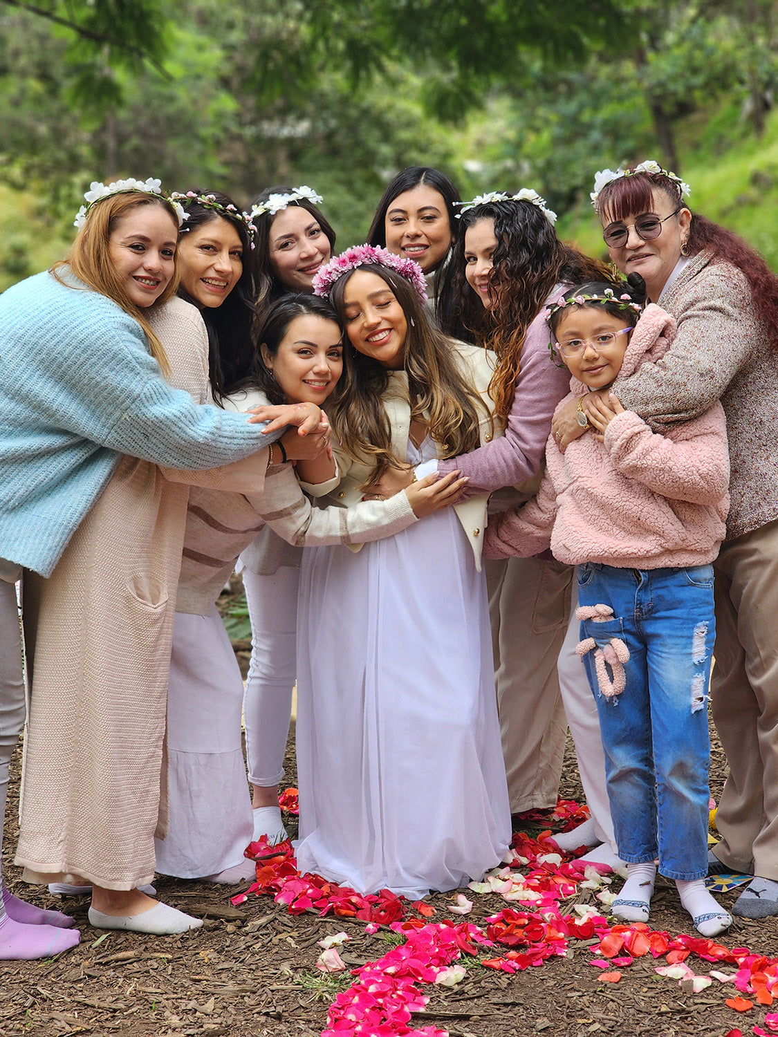 👑 Corona de flores naturales: Exclusiva para la festejada como símbolo de conexión y amor.